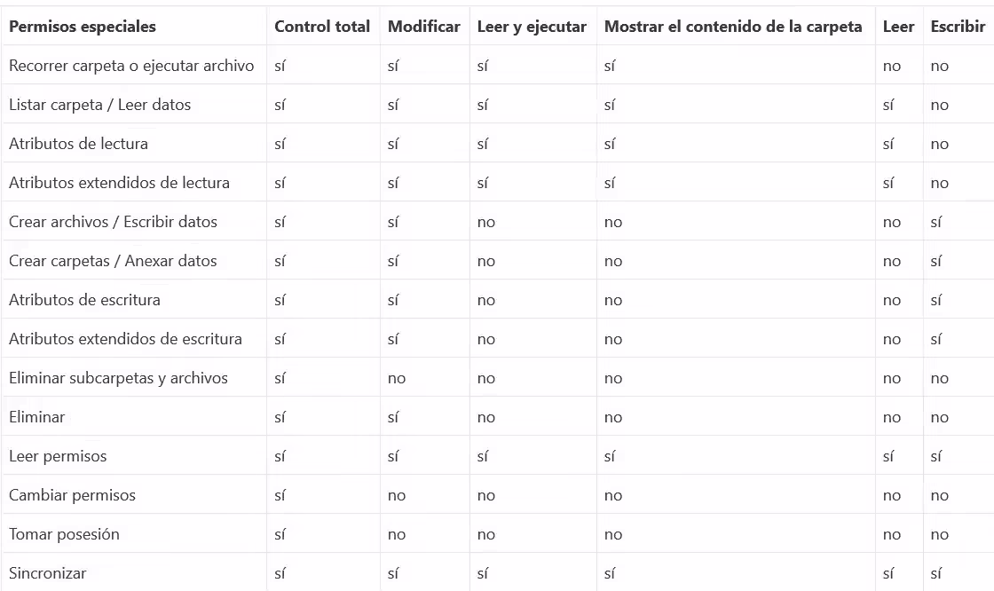 Entre los permisos de carpetas se incluyen Control total, Modificar,Leer y ejecutar, Mostrar el contenido de la carpeta, Leer y Escribir. Cada uno de estos permisos consta de un grupo lógico de permisos especiales que se enumeran y definen en las próximas secciones.