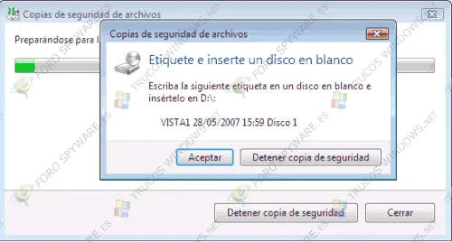 Por defecto, una vez se termina de configurar la copia, ésta se realiza de forma automática, por lo que el sistema mostrará las siguientes pantallas, una para informar de que la copia de seguridad ya está en curso y otra para pedir el dispositivo en el que se va a almacenar: