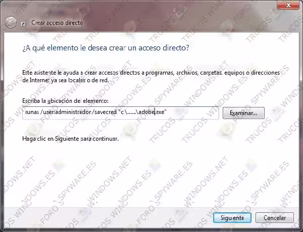 Cambiamos administrador por el nombre de nuestro usuario administrador y c:….adobe.exe por la ruta completa al programa.